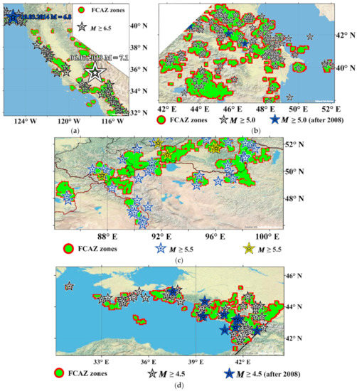 In the studied regions, FCAZ zones occupy a relatively small area as compared with the total seismicity field, which makes up 30%–40% of the total seismicity space and 50%–65% of the space where earthquakes with M ≥ MR occur. This illustrates the spatial nontriviality of the obtained results.