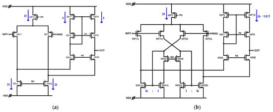 While maintaining low-power consumption, the performances for high, open-loop gain, fast slew rate, large-output swing, and low-noise characteristics should be achieved for high precision signal aquation. The folded cascode (FC) topology is widely used for gain stage in the amplifier, as shown in Figure 1a. However, as shown in Figure 1a, the role of transistors MN1 and MN2 is only limited to providing the small-signal input current to the folding node. To overcome this inefficiency, a modified FC was presented, replacing the current source with active current mirrors, as shown in Figure 1b, called recycling folded cascode (RFC) [5].