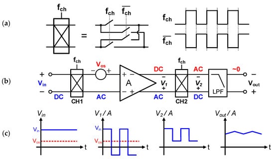 Chopping principle in the time domain (a) chopper; (b) amplifier with chopper; (c) ideal time domain signal waveforms. Adapted from [9].