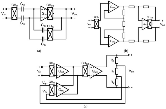Its input impedance is typically in the order from several hundred kΩ to several MΩ, determined by the impedance of the input capacitors and the chopping frequency. To increase the input impedance, the input impedance boosting schemes, using positive feedback or input pre-charge techniques, are used; however, the complexity of the stability and circuits are drawbacks [10,11]. As shown in Figure 3b,c, the 3-opamp IA and the CFIA receive input signals directly from the gate input node of the amplifier, and only the small gate input capacitances are only shown at the input node; thus, much higher input impedance can be achieved than with the CCIA.