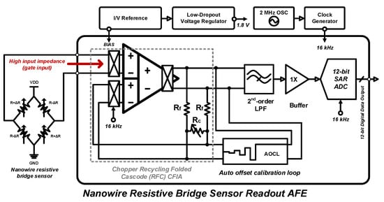 - Jiang, H.; Nihtianov, S.; Makinwa, K.A.A. An Energy-Efficient 3.7-nV/√Hz Hz Bridge Readout IC With a Stable Bridge Offset Compensation Scheme. IEEE J. Solid-State Circuits 2018, 54, 856–864. [Google Scholar] [CrossRef] [Green Version]