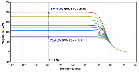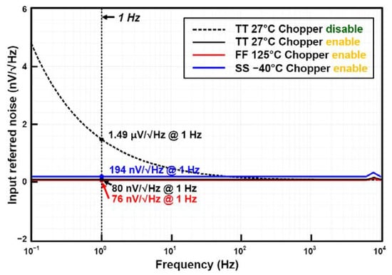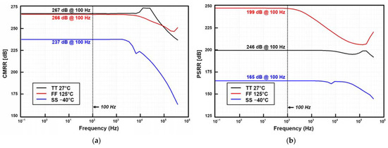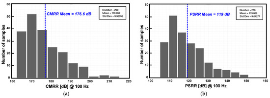 The simulated input–output characteristics of the RFC CFIA are shown in Figure 7. The coefficient of the determination R2 was calculated to be 0.9999, within the resistance variation (∆R) range of −380Ω~380Ω. Figure 8 shows the closed-loop gain of the proposed RFC CFIA, based on corner simulation. The closed-loop gain varies from 100.0026 V/V (at the FF 125 °C) to 100.9353 V/V (at the TT 29 °C). Figure 9 shows the input-referred noise, with corner simulation results, when the chopper is enabled and disabled. The input-referred, low-frequency noise at 1 Hz is reduced from 1.49 µV/√Hz (when the chopper is disabled) to 80 nV/√Hz (TT 27 °C) (when the chopper is enabled). The input-referred noise is reduced to 1/18.6 times with the chopper operation. The corner simulation results of the CMRR and PSRR are shown in Figure 10. The value of the CMRR and PSRR at 100 Hz varies from 237 dB to 267 dB and 165 dB to 199 dB, respectively. With the Monte Carlo simulations, the high CMRR and PSRR were obtained as shown in Figure 11. The mean values of the CMRR and PSRR at 100 Hz, with mismatch, are 176.6 dB and 119 dB, respectively. The simulations were performed with the default feedback gain configuration (DIN<3:0> = 1000, gain = 100 V/V).