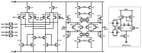 Figure 6 shows the schematic of the proposed chopper-stabilized RFC IA. To reduce low-frequency noise, the choppers are added to the input stage and the folded cascode stage. For using fully differential CFIA topology, the differential difference amplifier (DDA)-style input stages are needed. The PMOS differential pairs, MP1–MP4, form the recycling folded cascode input stage, and MP5–MP8 forms the feedback input stage. MN1–MN4 work as driving transistors, with a ratio of 5:6, as shown in (6).