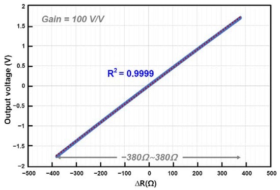Figure 12 shows the die photograph of the proposed resistive-bridge readout IC. The IC is fabricated using a TSMC 180 nm CMOS process, resulting in the RFC CFIA block size of 293 µm × 183 µm. The printed circuit board (PCB) was designed to evaluate the performance of the proposed IC, the test board and the measurement environment are shown in Figure 13.