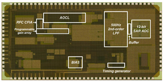 The proposed CFIA circuit used chopper stabilization techniques for low-noise performance, but the undesired offset of the resistive-bridge sensor also be amplified at the output stage of the CFIA. To solve this problem, we added an automatic offset calibration loop (AOCL) for offset cancellation. The AOCL consists of a comparator, a 12-bit SAR logic block, and a 12-bit R-2R digital-to-analog converter (DAC). When offset is amplified through the CFIA, the output of the CFIA is compared through the comparator input connected to the CFIA output. The output of the comparator passes through the 12-bit SAR logic to generate the corresponding 12-bit digital code and is applied as an input to the 12-bit R-2R DAC, which generates the corresponding compensation voltage to compensate the offset. The low-frequency noise, modulated at the chopper frequency, is shown at the output as a ripple; the 2nd-order 500 Hz LPF was used to remove the chopper ripple. The signal amplified through the IA is converted to the digital signal through the 12-bit SAR ADC, after ADC buffer. The detailed circuit implementations of the 500 Hz 2nd-order LPF, buffers for driving ADC, 12-bit SAR ADC, and AOCL are described in [14,15,16,17].