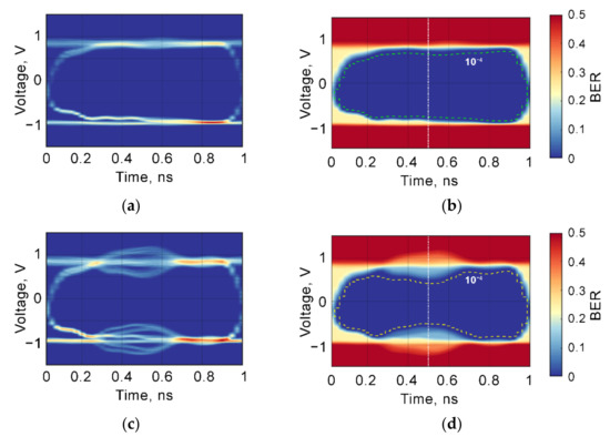 The Figure 1 shows an example of the ordinary statistical processing of waveforms with bit rate 1 Gbit/s captured using the digital oscilloscope [13]. The synchronous ensemble of cyclostationary signals can be represented by eye diagrams. Figure 1a,c present eye diagrams of measured signals without and with crosstalk interference, respectively, for the possible sampling phase during the unit interval with the duration of 1 ns. The crosstalk degrades the signal waveform decreasing the eye-opening width in the middle of the eye diagram. The corresponding BER plots are shown in Figure 1b,d. These plots show the quantity of eye-opening width for the given BER level. The green and yellow contours margin the BER level 10−4 for all sampling phases. The log-scaled BER plot can be viewed using a cross-section for the sampling phase corresponding to the middle of the signal bit response (white dash-dot vertical line).