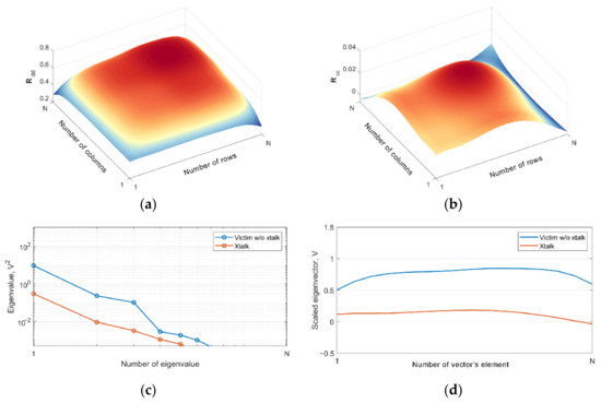 (a) The correlation matrix of the victim signal without crosstalk; (b) the correlation matrix of the crosstalk interference signal. (c) The eigenvalues of the correlation matrices and . (d) The scaled eigenvectors of the correlation matrices. Bit rate is 2.5 Gbit/s.