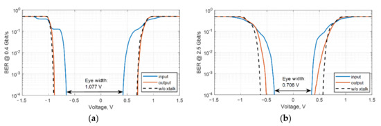 Figure 2 shows the comparison of the BER plots for signals without and with crosstalk interference [14]. The eye-opening width for the signal with crosstalk is 0.924 V.