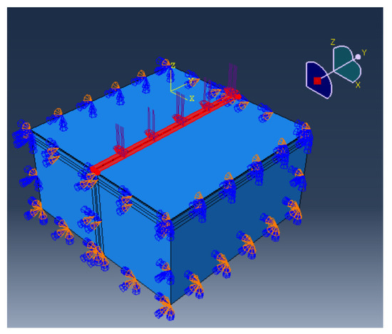 The initial time of the analysis step was set to 0.1 s on the basis of previous studies, and the total time of the analysis step was 25 s in order to control the solution time and take the calculation accuracy into account. The load area of traffic was set as two rectangular areas with a width of 0.213 m, a length of 6m, and an interval of 0.1065 m based on Chinese standard traffic load. In the static analysis of the structure, the load changes with the type of vehicle load. This paper adopts 1.0~2.6 times of the standard axle load specified in the Chinese highway pavement design code for analysis. When it is 1 time, the load should be 700 kPa. Boundary conditions were set as no stress, no displacement at the edge of the side and bottom of the model based on elastic layered system theory. In this paper, the pavement structure load and boundary conditions were set as shown in Figure 3.