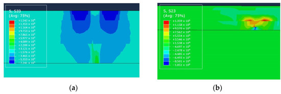 Figure 5a indicates that the asphalt pavement structure bears vertical compressive stress under the vehicle load. The entire road surface is subject to greater compressive stress in the area of the surface layer directly in contact with the wheel under normal circumstances, which means that most areas of the pavement structure are compressed in the +z direction. However, due to the existence of reflective cracks in the base layer, an area with positive normal stress appears in the predetermined crack area, which indicates that the pavement structure is compressed in the −z-direction in the crack area due to the existence of crack. In addition, it can be seen that from the stress contour that the cracks do not grow strictly in the preset vertical direction during the expansion process. The normal stress of the crack area is obviously greater than the right on the left side of the preset vertical direction, and the crack continues to grow on the left. The growing process is affected by many factors, such as load, the thickness of each layer, the modulus of each layer, and the shape function of the crack area in ABAQUS. Figure 5a shows that there is a type I cracking in the crack growth process, and Figure 5b shows that there is also type II cracking in the process. Figure 5b indicates that there is a sliding trend between the different layers. The sliding trend between adjacent layers is caused by the existence of reflective cracks, the contact between the pavement structure layers is no longer stable. With the further action of the load, pavement cracks will spread around the entire pavement structure, causing serious damage to the pavement structure.