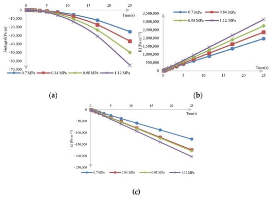 (a) J-integral time history curve (b) K1 time history curve (c) K2 time history curve.