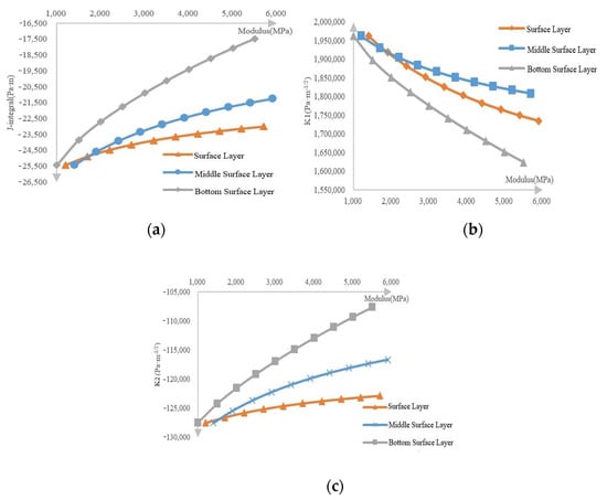 In addition, the values of J-integral and stress intensity factor both decrease with the increase in the modulus of each layer, and during the change of the modulus of the three-layer pavement structure, the change of the modulus of the middle surface layer has the least influence on the three parameters and the modulus of the bottom surface layer has the greatest influence. Figure 10 shows the curves of J-integral and stress intensity factors while modulus is changing.