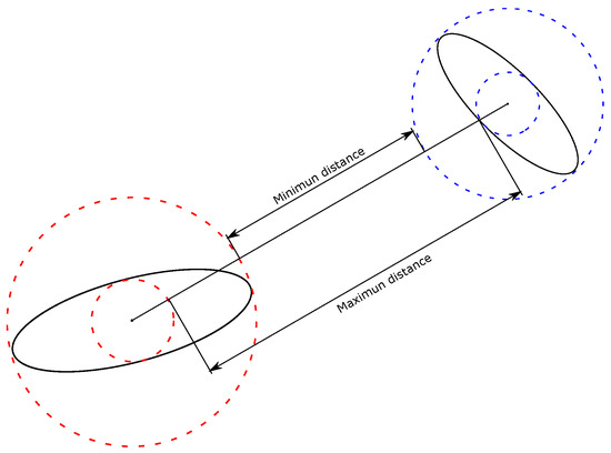 In Figure 3, we present a 2D scheme of the maximum and minimum distances between two ellipses. The desired distance will be between the minimum and the maximum distances and it will depend on the orientation of the ellipses.