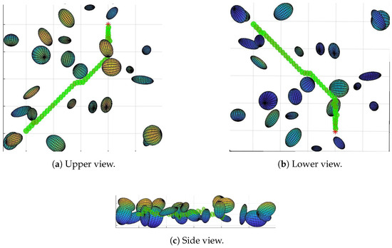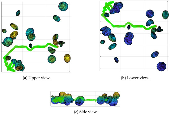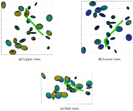 Path of map 2 generated with TLBO. The green ellipsoids represent the drone path and the multicolor ellipsoids represent the obstacles. Although it shows difficulties to find a path, it is safely pushed away the obstacles at the start.