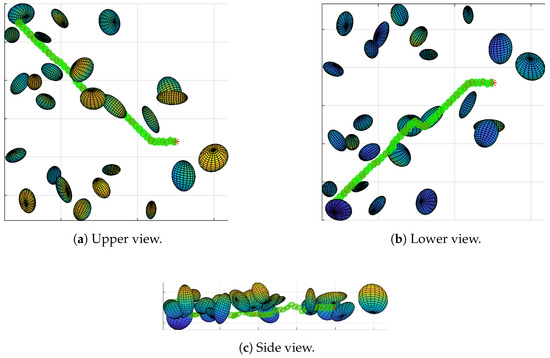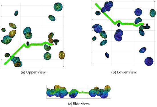 The figures display the path followed by the drone (green ellipsoids) to its target (red asterisk), avoiding on the way several obstacles (multicolor ellipsoids). As can be seen, the drone can easily follow the paths obtained by the algorithm. Maps, like those shown in Figure 8 and Figure 9, show little difficulty finding a path; even in the presence of convex obstacles at the start, the drone is safely pushed away until it finds a way to circumnavigate the obstacles. Comparing Figure 9 and Figure 10 it can be seen that, without the room, the path simply passes above and beside the obstacles.
