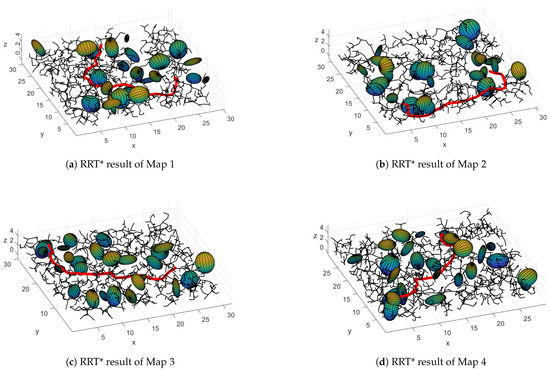 In Figure 13, we show the resulting path of the RRT* algorithm in the same four maps. Notice that the found paths avoid the obstacles but do not consider the ellipsoid that represents the UAV. We used a maximum of 5000 iterations, but for the mean convergence on the four maps it was 1348 iterations.