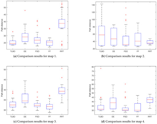 All the evolutionary algorithms used the same fitness function presented in (7). All the proposed methods are non-deterministic. To ensure the validity of the results, we ran each algorithm experiment 30 times on the same computer. The start and endpoints were the same for all the experiments. In Table 3, we present the comparison of the different methods. Notice that the evolutionary schemes have the best mean performance for maps 1, 3, and 4. In Figure 14, we show the box-and-whisker plots for each map and each method.