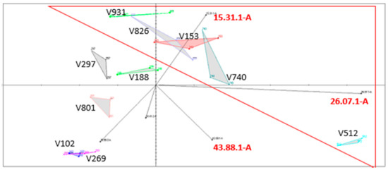 This figure also shows the odors captured by the e-nose during the analysis of the samples. Specific odorous substances produced by volatile organic compounds are represented by lines in the figure and their direction indicates the products that contain the most of them. At the ends of the lines are numbers used to identify the compounds that were present in the samples. We can confirm that samples V102 (NL), V269 (SR) and V740 (SR) are more extractive even though they contain fewer types of odorous compounds compared to the others. Odor compounds 26.07-1-A and 15.31.1-A (listed in Table 1) are typical of most hydroponically grown samples with strong discrimination power.