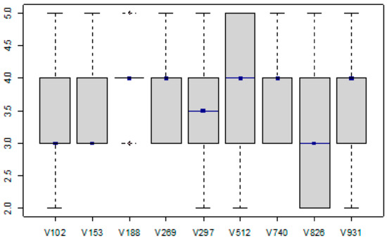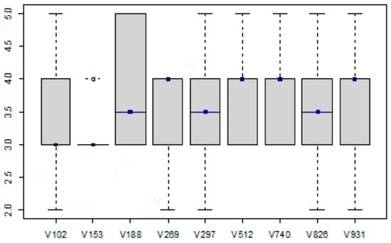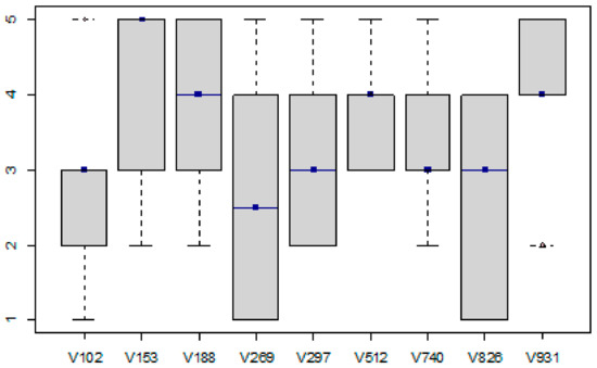 Another attribute evaluated by the sensory panel was the smell of the tomato fruit on the cut. From the data shown in the form of Figure 5, we can see that there were no clear worse or better results between the samples. Samples V188 (NL), V269 (SR), V512 (Strabena, CZ), V740 (SR), and V931 (SR) were evaluated as more satisfactory by the sensory panel in terms of odor on the cut. In contrast, samples V102 (NL), V153 (CZ), and V826 (IT) were characterized by a less intense aroma profile. In terms of the attribute evaluated, sample V297, which represents conventionally grown Belgian tomatoes, was rated as the most pleasant. The graphical distribution of samples V512 (CZ) and V826 (IT) tells us that these samples had a wide odor spectrum.
