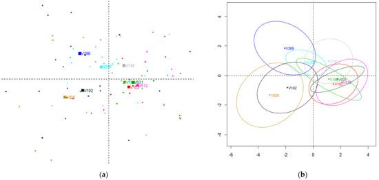 Within the second part of Figure 7b, the ellipses shown represent the variance of the values given in the sensory evaluation of each attribute. We can say that the samples V297 (BE) and V931 (SR) have the narrowest variance of the values obtained. A very wide variance is visible for samples V826 (IT), V102 (NL), and V269 (SR).
