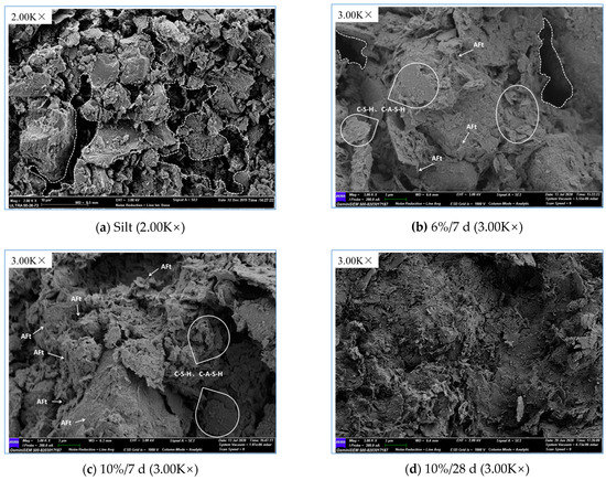 As can be seen from Figure 5c, with the increase in SNS content, more needle-like ettringite crystals (AFt), C-S-H gel, and C-A-S-H gel were produced [39,40]. This indicates that the hydration reaction in the early period became more sufficient with the increase in the content of SNS, and the hydration products increased significantly. The formation of needle-like crystals and flocculating substances could effectively fill the gaps between soil particles and played a stabilizing role, which made the soil structure more compact. This explains the variation of soil strength with the content of stabilizer. At the same time, as can be observed from Figure 5c, the microstructure of soil in the early period was mainly lamellar. There were a lot of AFt and hexagonal crystal Ca(OH)2 (C–H) on the surface of the soil. Compared with the original soil in Figure 5a, the gaps between soil particles were obviously reduced, and the direct connection mode of soil particles was also changed to the filling type, which improved the stability of the soil.