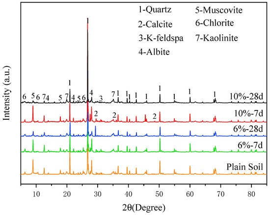 X-ray diffraction (XRD) is a commonly used method for qualitative analysis of mineral composition in nature. By comparing the XRD results of stabilized soil, the mineral composition changes to stabilized soil before and after adding SNS and at different ages can be better analyzed. The plain soil and SNS-S (6%/7 d, 6%/28 d, 10%/7 d, and 10%/28 d) were ground and dried for testing, and the diffraction angle of 2θ was set at 5~85°.