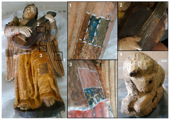Sculptures representing the musician angel with viola (left) and the lying lamb (right end). Details of the sampled zones and their stratigraphy are in sections 1 (wing), 2 (viola), 3 (blouse), and point 4 (lying lamb).