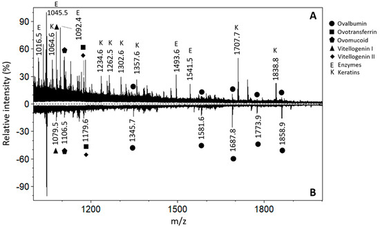 MALDI-MS spectra comparison between protein fraction from angel blue wing (A, above) and paint replica made of egg white mixed to CaCO3 (B, below). K stands for Keratin and E for Enzyme due to auto-proteolytic digestion.