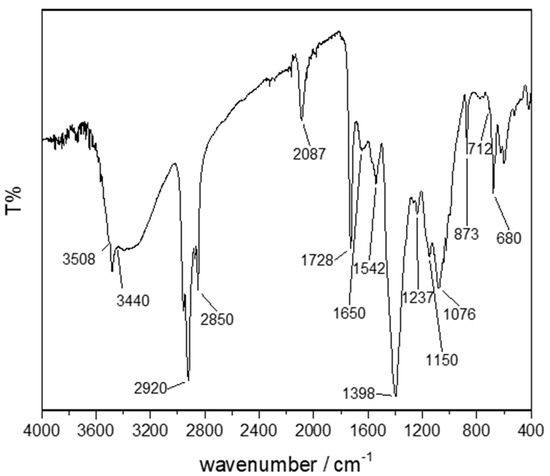 The micro-invasive procedure was carried out on a restricted zone of the lying lamb (see Figure 1, right-downside, Sampled Point 4). ATR-FTIR spectrum is explicative for the large heterogeneity of the sample (Figure S4). Inorganic fraction contributes to a larger extent to the spectrum’s shape because the organic binder materials, usually represent a minor fraction of the overall painting composition [5]. In this case—by comparison with ATR-FTIR reference spectra of pigments as such and pigments with linseed oil freely available online [51,52,53] and other literature data [54,55]—a yellow (Italian gold) ochre (goethite, α-FeOOH) can be presumably present, though the intensity of its associated peaks (Figure S4B) is quite low. These features are similar to those reported in [55]. In Sampled Point 4, the main signals (as labelled in Figure S4A) are ascribed to accessory minerals like CaCO3 (peaks at 1412, 873, and 712 cm−1) and gypsum (features at 3523, 3400, 1620, 1109, 667, and 600 cm−1), thus hindering the contribution of the pigment to the spectrum. In a similar way, only few signals associated to the binder (quite likely a drying oil) were identified at 2918, 2850, and 1738 cm−1.