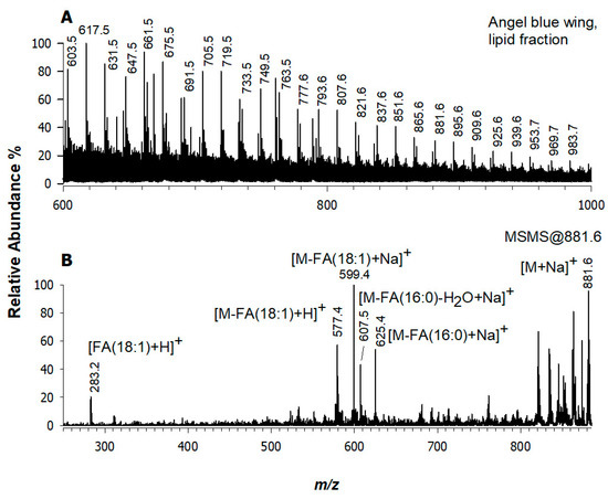 MALDI-MS spectrum of angel’s blue wing lipid fraction (A) and MALDI-MS/MS spectrum of the precursor ion as sodium adduct ([M+Na]+) at m/z 881.6 corresponding to [TAG (52:2)+Na]+ (B).
