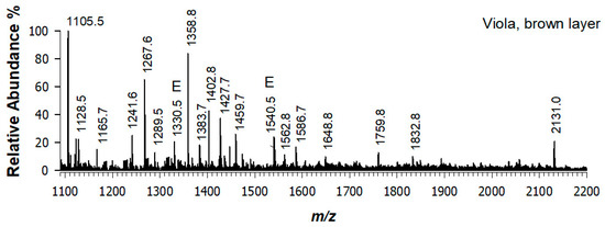 The non-invasive sampling protocol based on the pHEMA/PVP hydrogel was applied on the most superficial dark brown layer of the angel’s musical instrument (Figure 1 Sampled point 2). After a ZipTip purification step, the MALDI-MS spectrum of the peptide mixture was acquired (Figure 5). The resulting PMF was interpreted as follows; most peak signals were typical of collagen peptides, among which, for example, peaks at m/z 1105.4, 1267.5, 1427.5, 1459.5, and 2130.8 were due to peptides of collagen α-1(I) or collagen α-2(I) chains [20,21,38,39,40]. A detailed interpretation of MS signals is reported in Table 1. For the sake of clarity, we refer to “animal collagen” because it is not possible to establish the exact taxonomy of mammal’s collagen-type proteins due to the sequences digestion similarity of collagen between bovine, goat, and rabbit [20,41]. Moreover, it should be noted that chymotrypsin/trypsin digestion of mammal collagen sequences produces a PMF which is somewhat overlapping that one generated from the only trypsin digestion. This is consistent with our previous findings [20] and it may be due to a rather low number of chymotryptic cleavage sites i.e., phenylalanine, tyrosine, or tryptophan [42] occurring in collagen. Signals at m/z 1330.5 and 1540.5—appearing relatively intense in the spectrum and labelled with E—are ascribed to enzymes’ auto-proteolytic digestion confirming the low amount of proteinaceous material on the investigated layers.