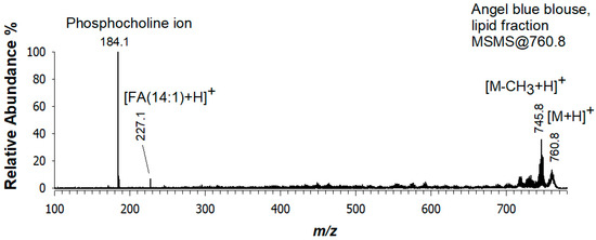 MALDI-MS/MS of a precursor ion as protonated adduct at m/z 760.8 assigned as a likely [PC(34:1)+H]+ and retrieved in the angel’s blouse onto the blue layer.