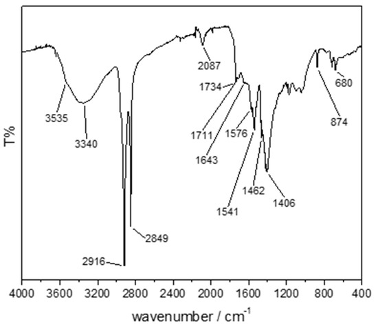 Under the surface of the most recent painting, a blue layer was revealed (Figure 1, Sampled point 3). Minute quantities of the blue surface were removed and subjected to lipid extraction. The MALDI-MS spectrum in positive mode exhibited the presence of peaks at m/z 732.8 and 760.8 recognized as phosphatidylcholines from egg yolk [43,44,45] most likely employed as a paint binder. MALDI-MS/MS spectra of precursor ions at m/z 732.8 and 760.8 as protonated adducts were respectively recognized as PC (32:1) and PC (34:1). Their fragmentation pattern appears typical for the class of PC which are easily identified through the diagnostic phosphocholine head-related ion at m/z 184 being the base peak when working in positive ionization mode. Concerning the precursor ion at m/z 760.8 shown in Figure 6, the appearance of a very low abundance ion at m/z 227.1 could correspond to [FA(14:1)+H]+, thus suggesting the occurrence of a PC (14:1_20:0) considering that the sum composition should be PC(34:1). The presence of PC suggests the use of an egg-based binder for this painting layer since phosphatidylcholines typically compose the lipid fraction of egg yolk [33,46,47]. The use of this binder is corroborated by the ATR-FTIR spectrum acquired on the sample (Figure 7). In this case, the main signals at 3340, 2916, 2849, 1734, 1711, 1643, and 1541 cm−1 suggested the presence of a mixed binder of lipidic and proteinaceous components (such as egg yolk). In particular, the bands at 1734 and 1711 cm−1 are consistent with the presence of aged egg yolk, imputable to aldehydes and acids from triglycerides and/or imide bonds by oxidation of protein amidic bonds [48,49]. The spectral features at 1643 and 1541 cm−1 are compatible respectively with amide I and amide II stretching, though the higher intensity of the latter can be related to the contribution of calcium and lead carboxylates [49,50]. Calcium carboxylates could be responsible also for the shoulder at 1576 cm−1. The presence of basic lead carbonate can be inferred by a shoulder at 3535 cm−1 and the peaks at 1044 and 680 cm−1, whereas the signals at 1406 and 874 cm−1 are diagnostic for the use of CaCO3. Moreover, it is evident the characteristic band of CN stretching at 2087 cm−1, suggesting that Prussian blue is present as a pigment. Notably, the peak at about 1400 cm−1 of blue sampled areas was assigned to both basic lead carbonate and calcite (CaCO3), even if its intensity is uneven in these two cases suggesting a stratigraphic differentiation.