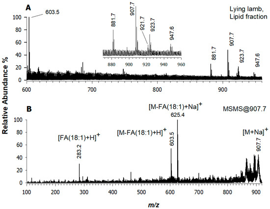 (A) MALDI-MS spectrum of the lipid fraction extracted from the sampling point on the lying lamb. (B) MALDI-MS/MS spectrum of the precursor ion at m/z 907.7 was recognized as [TAG(54:3)+Na]+.