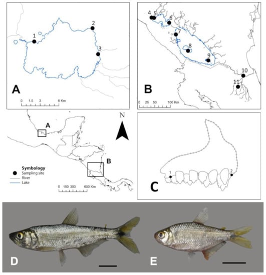 We collected Astyanax fish of the two different morphs from two geographical systems: in México, from Lake Catemaco (belonging to Papaloapan basin); and in Central America, from San Juan River basin, which includes Lake Managua, Lake Nicaragua, and the Sarapiquí River, which flows into the San Juan River, the outlet of the two mentioned lakes (Figure 1). We focused on late ontogenetic stages (i.e., post-embryonic development), as is usual in allometric trajectories studies (see []). We analyzed a total of 218 specimens (130 deep-body and 88 elongate-body) collected in 11 sampling sites in both systems between November 2011 and January 2017 (Table 1, Figure 1). We used cast nets and gill nets to collect the fish and assigned specimens to morphs based on their external morphology [,]. Fish were euthanized in iced water and voucher specimens were deposited at the Colección Nacional de Peces, IBUNAM, México.