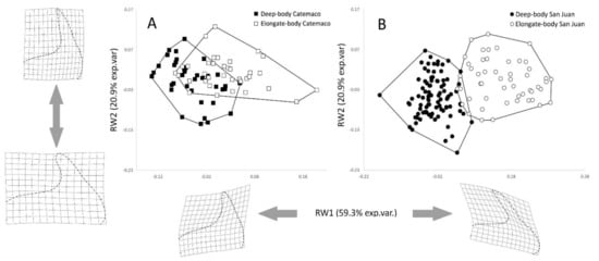 A shared pattern for both systems corresponds to the extended allometric trajectory in the elongate-body morphs, corresponding to parallel evolution when compared with their sympatric deep-body morphs. This corresponds to changes in the length of trajectories and, hence, to changes in magnitude []; consequently, the elongate-body morph can form a longer premaxilla, while the deep-body morph showed a truncated trajectory. In addition, in agreement with the role of size in Astyanax diversification, Ornelas-García et al. [] reported in Lake Catemaco a longer body size in the elongate-body morph when compared with the deep-body morph, which also corresponded to an extended trajectory for the elongate-body morph. The patterns of the late ontogenetic allometric trajectories for RW2 were contrasting with the patterns for the RW1. As evidenced by the regression analysis, only the deep-body morph from the San Juan system showed a positive correlation between RW2 and log centroid size, resulting in convergent allometric ontogenetic trajectories for morphs in this system. The shape variation described by the RW2 (width of the premaxilla and length of ascending process) is not clearly associated with morph differentiation in both systems, and therefore, we hypothesize that these premaxilla features are probably not associated with the trophic specialization of morphs.