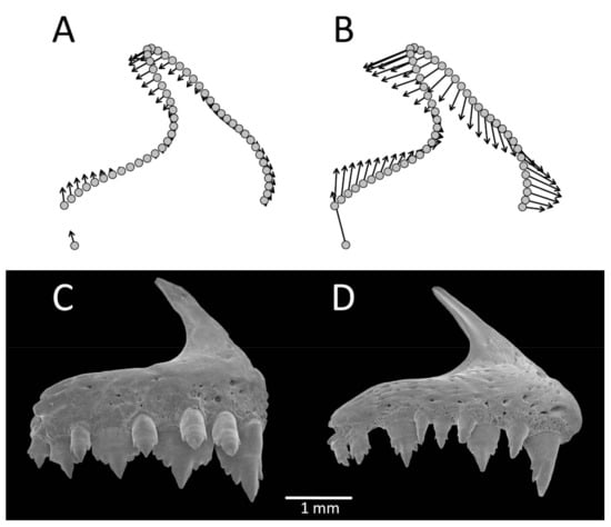 Differences in the consensus shape of premaxilla between morphs for (A) Lake Catemaco and (B) San Juan River systems. Gray dots in the shapes in (A,B) represent the deep-body morph used for reference; change vectors in black show the deformations toward the sympatric elongate-body morph. Examples of premaxilla of the elongate-body morph for (C) Lake Catemaco and (D) San Juan River systems.