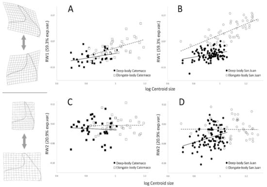 Late allometric ontogenetic trajectories of the shape of premaxilla. RW1 and RW2 on log centroid size for (A,C) Lake Catemaco system and (B,D) San Juan River system by morph. Deformation grids on the left show shape variation along RW1 (Y axis) in (A,B), and RW2 (Y axis) in (C,D).