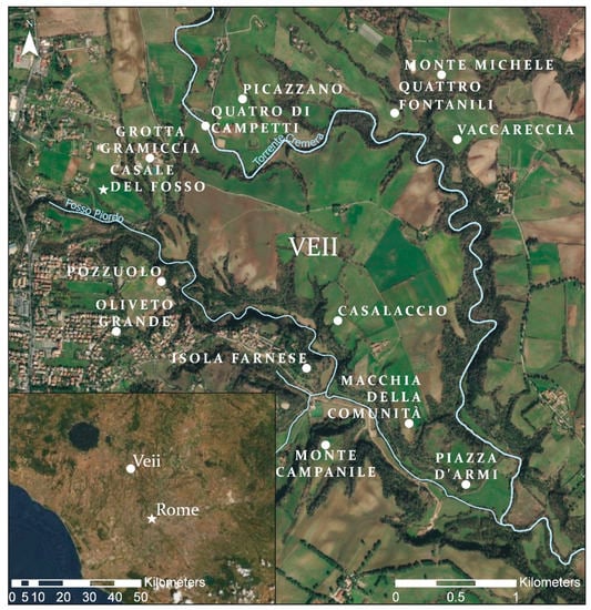 - Ward-Perkins, J.B. Veii: The historical topography of the ancient city. Pap. Br. Sch. Rome 1961, 19, 1–124. [Google Scholar] [CrossRef] [Green Version]