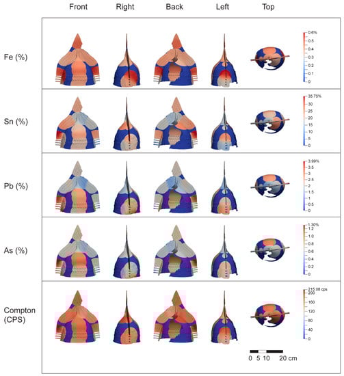 In Figure 5, we display views of the helmet with interpolation values of the pXRF analysis we determined as the most useful for examining the helmet, those being Fe, Sn, Pb, As, and the Compton values. The colours for each element were designated based on the maximum value, which is red in Figure 4. As there were no elements with a measurement of zero, the colour blue was treated as a null value and was also the minimum value on the scale. The interpolations were conducted at a radius of 5 cm so as to allow some blending of values while not over-representing the assay data on the object. As the search radius was 5 cm and the helmet was much thinner than that, in some cases under 1 mm, it did not distinguish well between different sides, which has implications for the interpretation of the different sheets the helmet is made from, as we discuss further below. However, it did provide an indication of the composite nature of the helmet as it presently exists, which is the result of both the initial production techniques and the post-depositional factors—most notably patination.