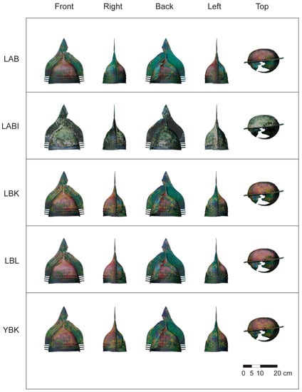 The final method of analysis applied to the helmet was decorrelation stretching through the use of the DStretch [,] plugin for the image processing software Image-J []. Decorrelation stretching exaggerates the colour separation of an image and was selected as it could be applied to already available data, mainly the texture generated for the photogrammetry model. The colorspace algorithms were selected based on those that displayed the most visual distinction (Figure 6). The most distinct variation was identified at the darker end of the hue spectrum, which was also the case for pigments in rock art []. Distinctions were identified over some parts of the model. For instance, the colorspace LABI identified one side as more heavily patinated than the other, with the patina showing up in white. This likely relates to the way it was deposited in the tomb and later preserved in plaster, lying on its side, and also likely contributed to the differential preservation of the helmet, with one side (Back view in Figure 6) featuring significantly more damage than the other.