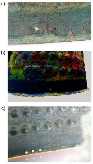 Additionally, the decorrelation stretching highlighted a band around the lower segment of the helmet, which seemed to be covered in an organic element that disappeared. This band is visible to the naked eye (Figure 7a), although it lacks definition. The decorrelation stretching clearly revealed that the band originally went all the way around the helmet, even covering the plates at the forehead and the nape (Figure 7b). The fact that the band seemed to cover the plates, which included circular design elements (one of which may have been associated with a rivet), hints that it was a later addition and was perhaps not planned at the outset (Figure 7b). It should also be noted that space for a band was left on the bowl of the helmet, which was otherwise richly decorated with repoussed and punched features (Figure 7c). This reveals details about how the item would have looked in antiquity, visibly combining organic and metal elements on the exterior in addition to the organic elements which were likely present on the inside and the chinstrap.