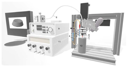 To form nanocomposites in a three-dimensional form, the obtained disperse medium in a liquid state was applied in layers. The layers of SWCNT1/SWCNT2 with albumin alternated with layers with collagen. Each layer of the dispersion was transformed from liquid to solid state under the action of laser radiation using the developed laser setup (Figure 1). After drying the dispersion layer, the volume of dispersion necessary for the formation of the next layer was poured on it, after which laser treatment was performed again. Physical mixture of components without laser treatment does not promote the formation of a bonded nanotubes framework; this does not ensure the formation of nanocomposites. Exposure to electromagnetic laser radiation is necessary for the formation of strong electrically conductive nanocomposites [16,47]. The setup made it possible to apply uniform layers of dispersion (1) in a container (2) by an extrusion method using a nozzle (3) connected to a syringe (4). The positioning of the head (5) with the nozzle (3) was carried out using the movement system based on stepper motors of a three-coordinate system (X, Y, Z) on a massive bed. The movement accuracy reached 0.1 μm at a speed of 0.01 to 5 m/s. The head movement trajectory (5) was set using a computer 3D model. Moreover, an optical fiber (6) with a collimator (7) was connected to the head (5). Thus, the setup made it possible to move the laser radiation along a given trajectory along the deposited layers of dispersion (1) in the container (2). However, in this experiment, we used unfocused radiation (8), which moved along the vertical axis depending on the number of deposited layers. Plane-parallel radiation covered the entire area of the dispersion in the container (2). For this purpose, a diode laser (9) with a wavelength in the near IR range of 810 nm was used. The spatial profile of the laser radiation had a Gaussian shape. The setup contained a 630 nm pilot laser to illuminate the main IR radiation. The radiation power was varied from 0.1 to 3 W depending on the temperature of the layers. Temperature detection was carried out using an IR sensor (10) connected to a microcontroller (11), which changed the current supplied to the laser diode (12) in real time. Such construction makes it possible to control the heating of the liquid to the desired temperature, excluding the destruction of the protein structure. The creation of nanocomposites took place in the temperature range 40–55 °C. A heating table was used to preheat the dispersion (13).