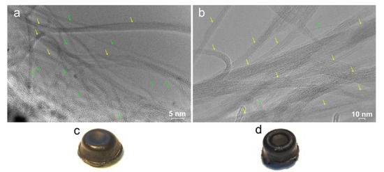 TEM images of SWCNT1 (a) and SWCNT2 (b) (green arrows indicate isolated nanotubes, yellow arrows indicate their bundles) and the appearances of the nanocomposites obtained with SWCNT1 (c) and SWCNT2 (d).