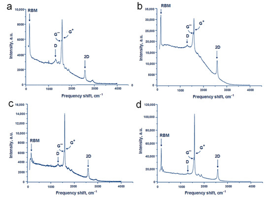 Figure 3c,d shows that the radial RBM-band (110–160 cm−1) is represented by several peaks, which indicates the presence of SWCNT2 of different diameters in the nanocomposite. SWCNT1-based nanocomposites had a narrow RBM-band with a high intensity, which is associated with a small spread of nanotube diameters.