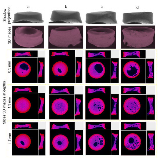 To study the microstructure of nanocomposites using X-ray tomography, the samples were fixed on object tables made of a polymer transparent for X-ray radiation. The scanning parameters were selected in accordance with the density and geometric dimensions of the nanocomposites. The rotation step was 0.1° when the sample was rotated 360° around its axis. This corresponded to ~4000 shadow projections and a spatial resolution of up to 10 μm. Figure 4 shows shadow projections and 3D views of nanocomposites from different types of nanotubes and with different concentrations. The analysis of projections and 3D views shows that nanocomposites take an even shape in the process of layer-by-layer formation. The middle part of all samples is lower in level than the peripheral region of the nanocomposites. This is due to the Gaussian shape of the laser beam with a maximum radiation intensity in the central region. To visualize the internal structure of the nanocomposites, visual sections were made with a step of 100 μm along the vertical axis of the sample. The main sections of the nanocomposite at distances of 0.5, 1.3 and 1.7 mm from the bottom point of the sample are shown in Figure 4. Each section is accompanied by three views—front view, top view and side view.