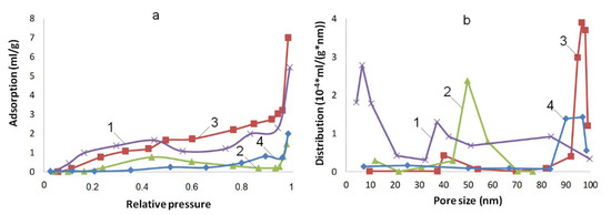 Nitrogen adsorption isotherms at 77 K (a) and pore size distribution (b) in nanocomposites: SWCNT1 (0.001 wt.%)—curves 1, SWCNT1 (0.01 wt.%)—curves 2, SWCNT2 (0.001 wt.%)—curves 3, SWCNT2 (0.01 wt.%)—curves 4.
