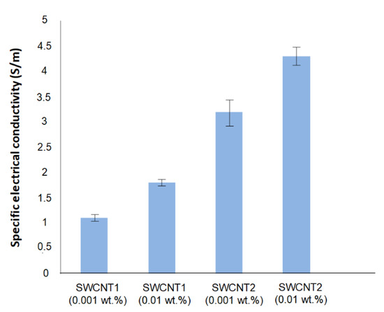 Figure 6 shows the conductivity data for nanocomposites with different compositions. The diagram shows that an increase in the SWCNT concentration from 0.001 to 0.01 wt.% leads to an increase in the specific electrical conductivity of nanocomposites from 1.1 ± 0.05 to 3.2 ± 0.1 S/m. The increase in electrical conductivity depends on an increase in the number of X- and Y-shaped percolation nodes. Consequently, higher concentration of nanotubes increases the probability of binding of defective nanotubes regions located at a distance of 1.38 to 1.55 Å from each other. In this regard, Figure 6 shows regularity in the excess of electrical conductivity in nanocomposites with SWCNT2 compared to nanocomposites with SWCNT1. From the analysis of the Raman spectra, it was found that the defectiveness in the nanocomposites with SWCNT1 is higher than in the samples with SWCNT2. Most likely, this is due to the fact that the defective regions of SWCNT1 formed chemical bonds to a greater extent with protein molecules in nanocomposites than with each other. While in nanocomposites with branched 3D networks of SWCNT2, their defectiveness is much lower. Most likely, SWCNT2 formed covalent bonds with each other, increasing the electrical conductivity of nanocomposites to 3.2 ± 0.3 and 4.3 ± 0.2 S/m for 0.001 and 0.01 wt.%, respectively. However, the lower stability of SWCNT2 in a water-protein dispersion led to a larger error in measuring the electrical conductivity compared to nanocomposites based on more stable and homogeneous dispersion with SWCNT1. It is known that the electrical conductivity of the native myocardium varies in the range of 0.03–0.6 S/m [56]. Therefore, the implantable part of the device for electrical stimulation of the myocardium or restoration of its structure must have comparable or higher electrical conductivity values. Thus, nanocomposites created from both types of SWCNT with both concentrations are suitable for such a task.