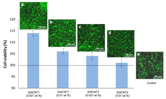 Diagram of MTT assay and fluorescence microscopy images of heart fibroblasts on nanocomposites based on SWCNT1 (0.001 wt.%) (a) SWCNT1 (0.01 wt.%) (b) SWCNT2 (0.001 wt.%) (c) and SWCNT2 (0.01 wt.%) (d) relative to control (cover slip) (e) after 72 h of incubation.