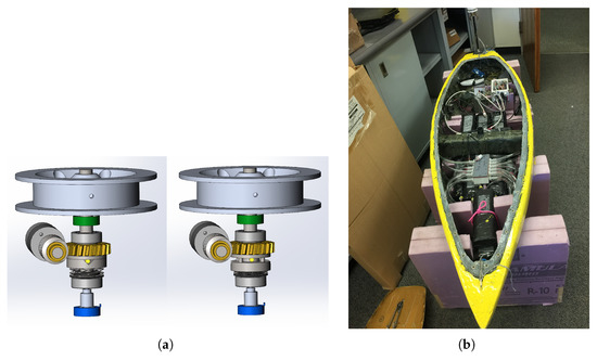 Mechanical fabrication. (a) Control drive assembly with clutch in two positions; (b) picture of the hull enclosure with electronics.